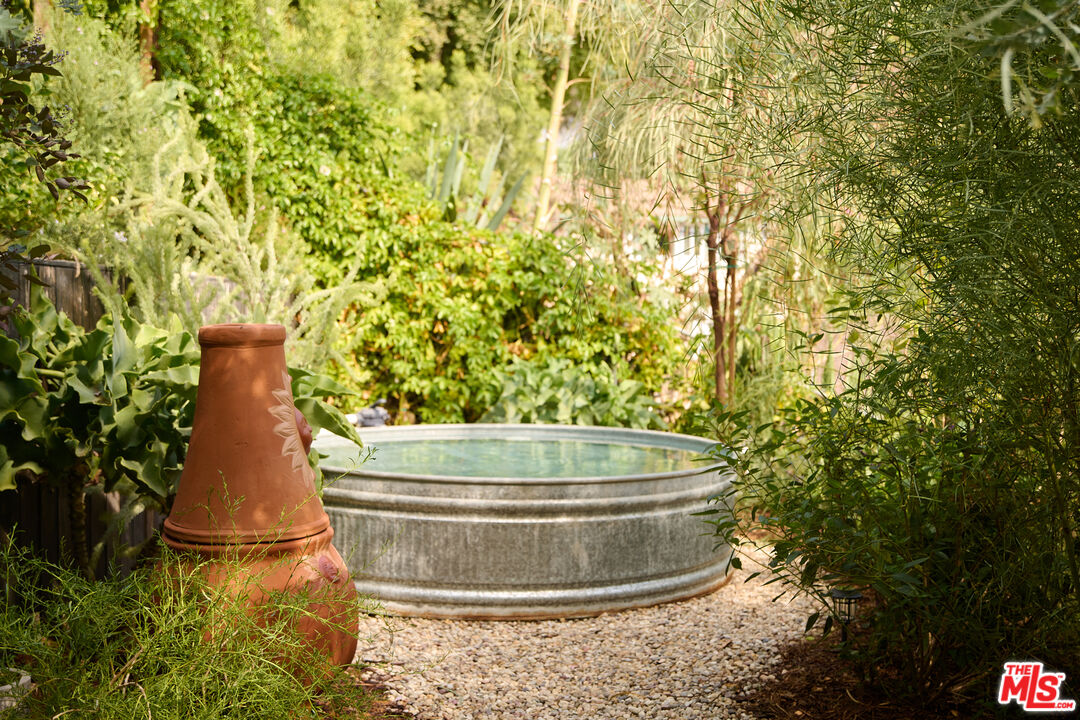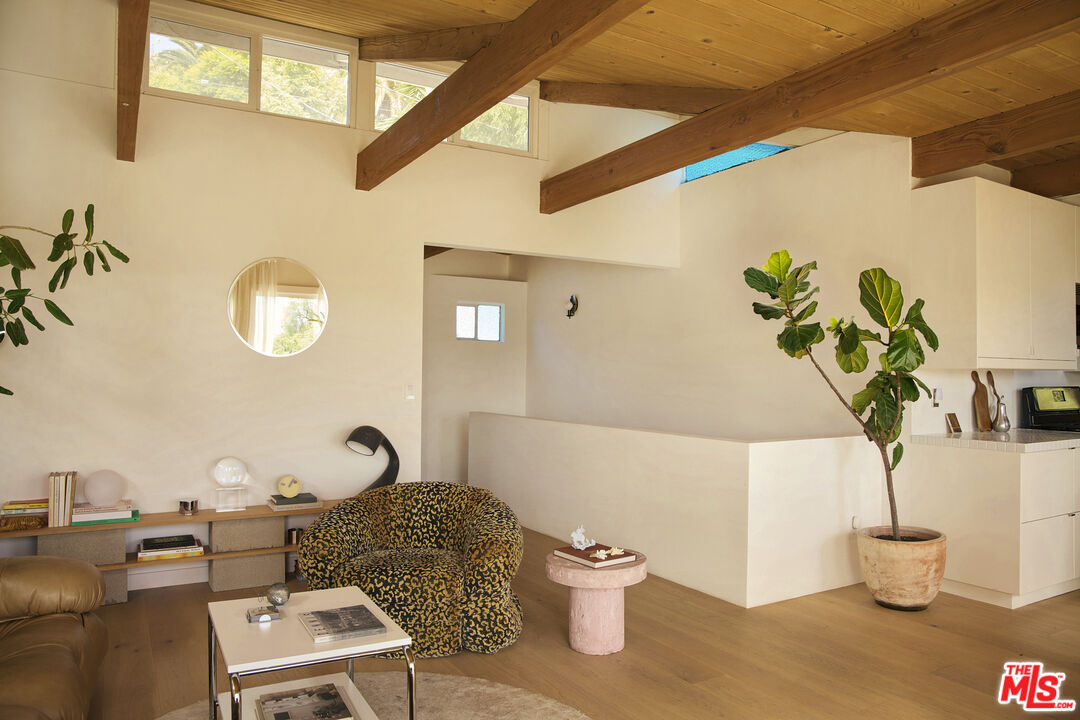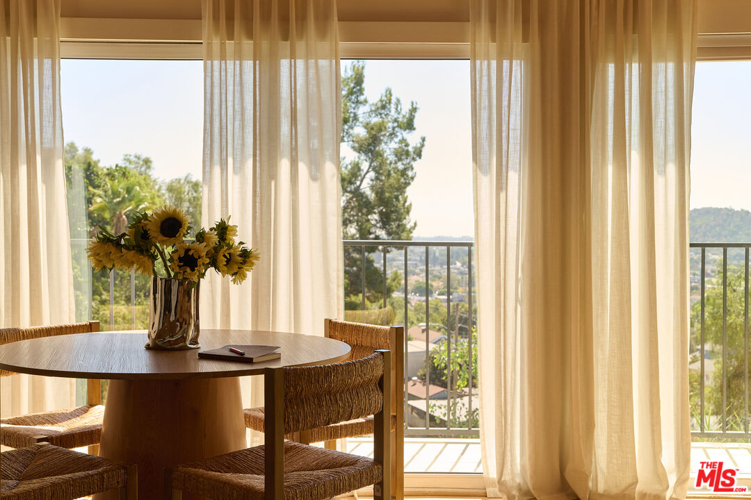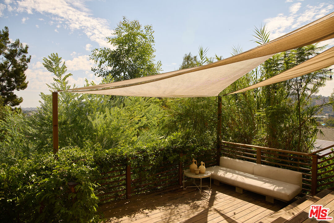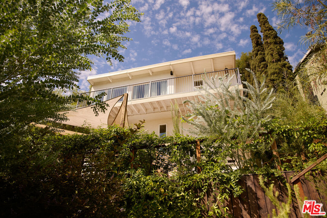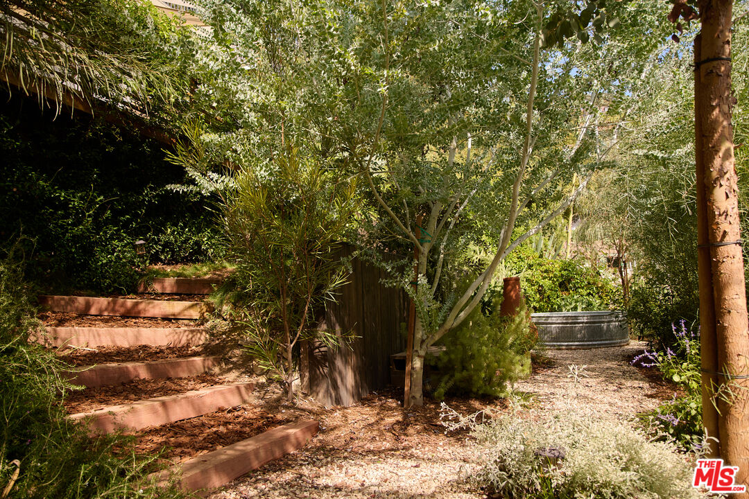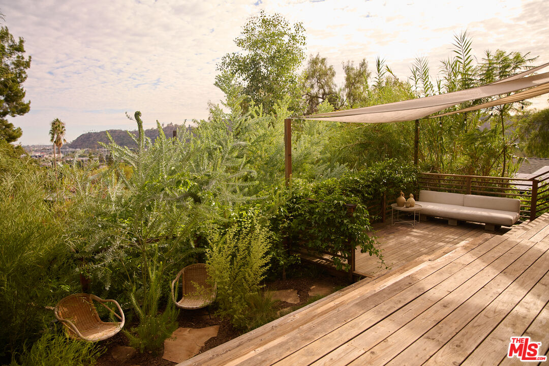 Perched in the foothills of Mount Washington, this striking 2 bedroom, 2 bathroom mid-century modern hillside home offers high design, city views, and a dreamy, perfectly landscaped yard, a true tranquil refuge. The home offers a newly designed and renovated kitchen and bathrooms, featuring chic matte tile, Eny Lee Parker light fixtures, and Phylrich showerhead, faucet, and fixtures. The expertly curated, expansive backyard offers a series of intimate vignettes for relaxation and entertaining, including built-in seating, an outdoor dining area, a dipping tub under a canopy of mature eucalyptus trees, olive trees, and an abundance of fruit trees. The main level opens to an airy, open-concept layout defined by vaulted wood-beamed ceilings, clerestory windows, and a dramatic wall of glass. The freshly reimagined kitchen with its custom cabinetry, tile countertops, and designer lighting anchors the living space and provides a dining area flanked by floor-to-ceiling windows. An upper-level patio extends off the kitchen, allowing a serene space to soak in the views with morning coffee. A fully renovated main floor bathroom features refined tilework and sleek fixtures, completing a level that feels both warm and sophisticated. The lower level features two spacious bedrooms, each with ample closet space, and a charming outdoor patio located off the primary bedroom. The shared bathroom has generous proportions, modern finishes, including a Kelly Wearstler light fixture, stone countertop, and Kohler hardware. Step outside into a garden that feels like its own hidden world, a lush, layered landscape filled with mature fruit trees, towering eucalyptus and acacia, and meandering passion fruit and star jasmine vines that drape with effortless beauty. Multiple seating areas are tucked throughout, inviting quiet mornings with coffee or long afternoons beneath the trees. A flagstone pathway winds through the designer-curated California and Australian native greenery, leading to a 10-foot filtered cowboy tub set perfectly for stargazing nights, while expansive decks and shaded nooks offer space to dine, gather, or simply breathe it all in. It's a rare and romantic outdoor sanctuary alive with texture, scent, and soul. This Mt. Washington residence offers an elevated lifestyle in one of Northeast LA's most sought-after enclaves. Enjoy easy access to the best of the vibrant Eastside culinary scene, including Barra Santos, Wife & Somm, Dunsmor, Little Ripper, and The Grant. Begin the day with coffee from Loquat before exploring nearby Moon Canyon Park or the trails of Elyria Canyon. A home of striking form and function, it embodies the ideal fusion of modern design, California hillside living, and outdoor splendor.