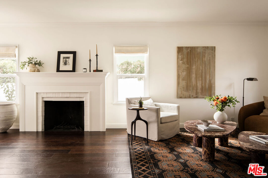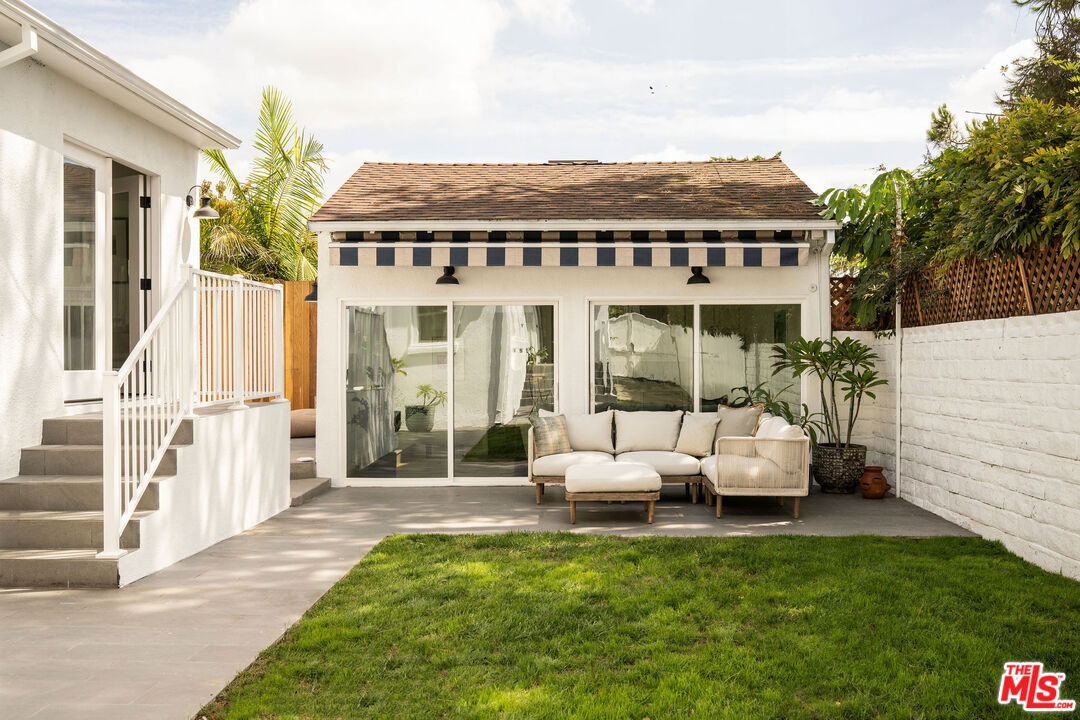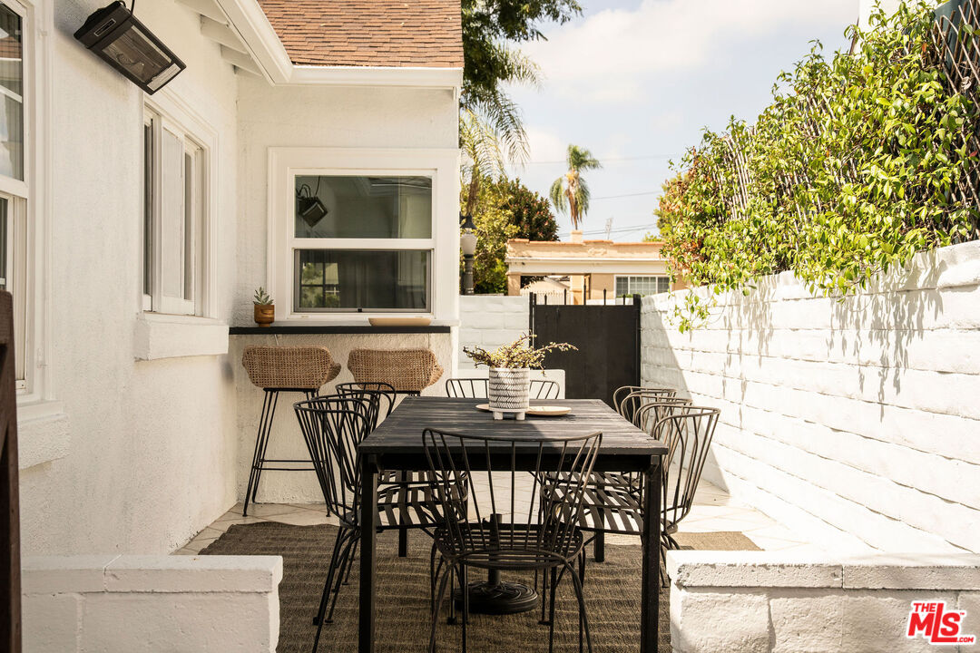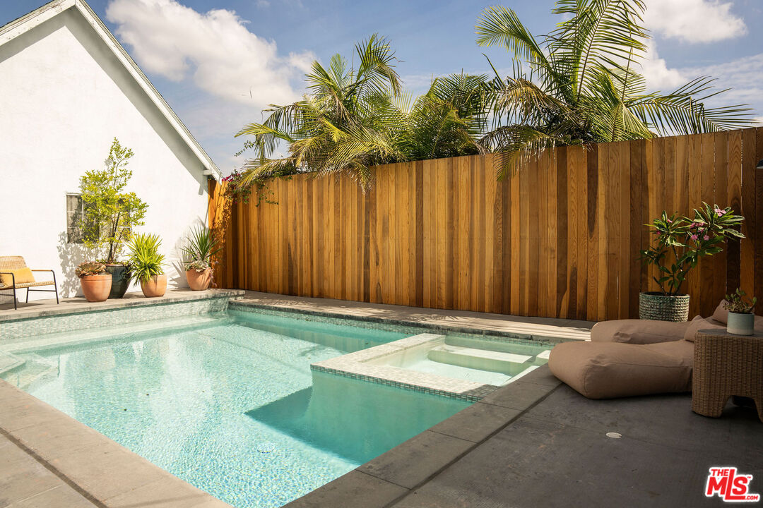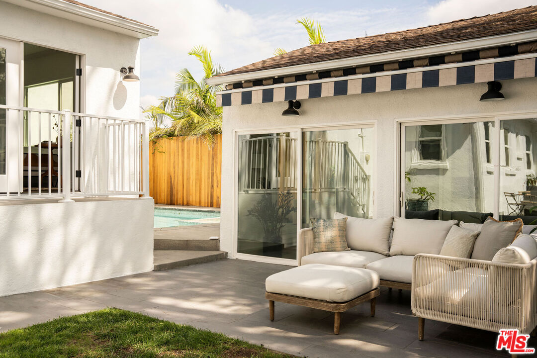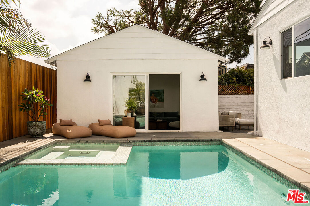 In the heart of Larchmont Village, the property consists of a 3 bed, 3 bath, 2,125 sq. ft. home plus 335 sq. ft. poolside studio with kitchenette and bathroom, offering privacy, elevated design, and effortless indoor/outdoor living. Thoughtful details abound from the chef's kitchen with premium appliances, to a serene primary suite opening to the backyard, to an additional 615 sq. ft. loft space upstairs. Designed for entertaining and everyday ease, and situated just two blocks from Larchmont's best restaurants and bars, the magical home offers a sanctuary in one of LA's most sought-after neighborhoods. A picturesque walkway canopied by an oversized front oak tree leads to the front entry, where a long foyer introduces the home's inviting layout. The living room, anchored by a gorgeous fireplace, offers a warm gathering space, while the dining room flows effortlessly into the kitchen for seamless hosting. The kitchen is both functional and stylish, centered by a honed granite island, bar seating, and ample cabinetry for home storage. Premium appliances include a Wolf range and oven, a side-by-side Sub-Zero refrigerator and freezer, a Bosch dishwasher, an LG microwave, and a wine refrigerator. The kitchen opens to a beautiful private dining patio with an outdoor heater, perfect for entertaining and dining al fresco year-round. Down the hallway, find two spacious bedrooms sharing a full bath finished with a Restoration Hardware vanity. The primary suite sits at the rear of the home, a private retreat with a spa-like bath featuring a dual-sink vanity, soaking tub, and standing shower. A back room offers a flexible space that can be used as an office or converted to a large walk-in closet with French doors opening to the side yard. Backyard living feels like a private oasis - fully fenced with a grassy lawn, patio with an electric awning, and sparkling pool and spa. A detached studio enhances the setting with its own living area, full bathroom, kitchenette featuring Bertazzoni and Fisher & Paykel appliances, plus a full-sized refrigerator and freezer. Sliding doors open directly to the pool deck, making it ideal for guests or entertaining. Upgrades throughout the residence include newer engineered hardwood flooring, a dedicated 240V outlet for EV charging at the front of the home, Nest security cameras, and a newer Carrier HVAC system with condenser and all-new ductwork. Additional highlights feature a newer tankless water heater, upgraded electrical and plumbing systems, and newer windows, doors, and sliders throughout. Just moments from Larchmont Village, the home offers easy access to endless shops and eateries, including Great White, Cookbook, Larchmont Bungalow, Larchmont Wine & Cheese, Sam's Bagels, Go Get 'Em Tiger, Jeni's Ice Cream, and more. This private and serene residence blends small-town charm with city convenience, an elevated lifestyle in one of Los Angeles' most desirable neighborhoods.
