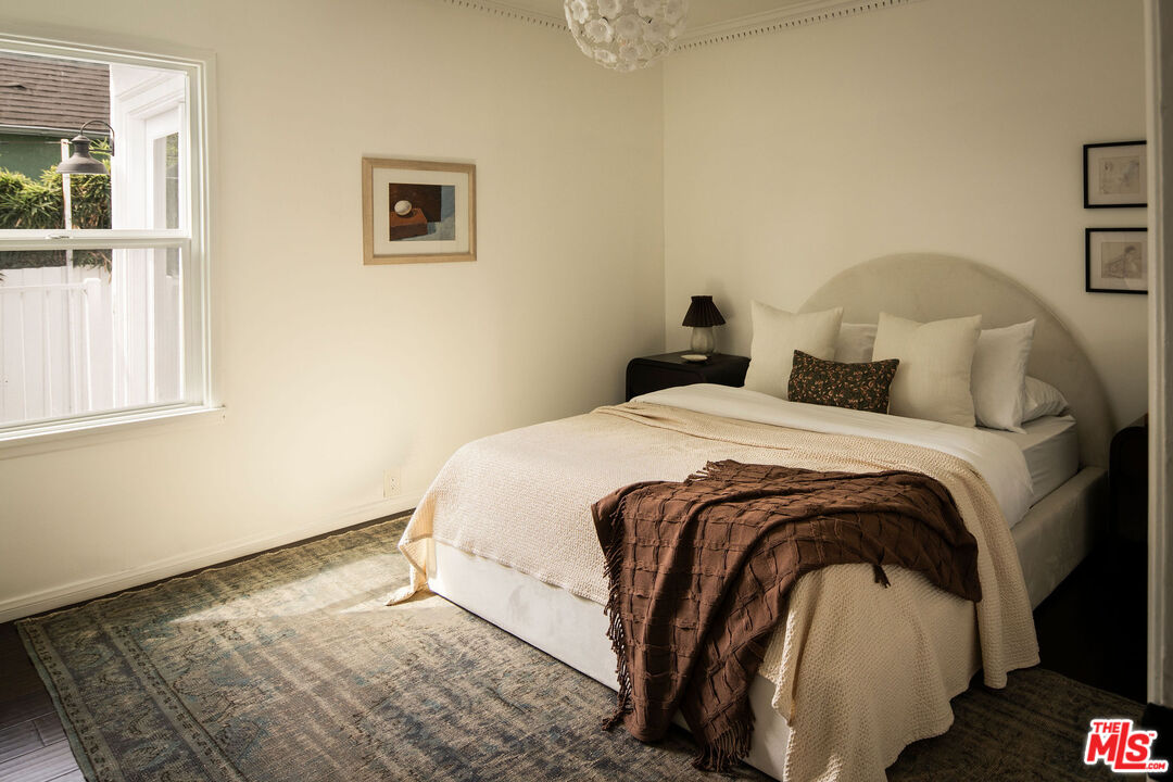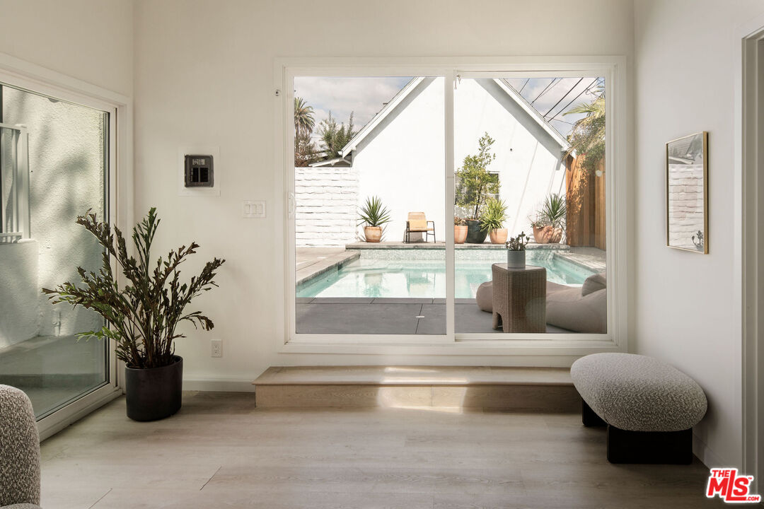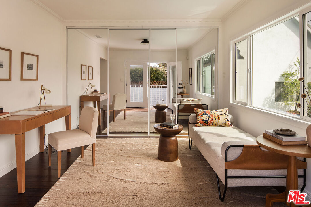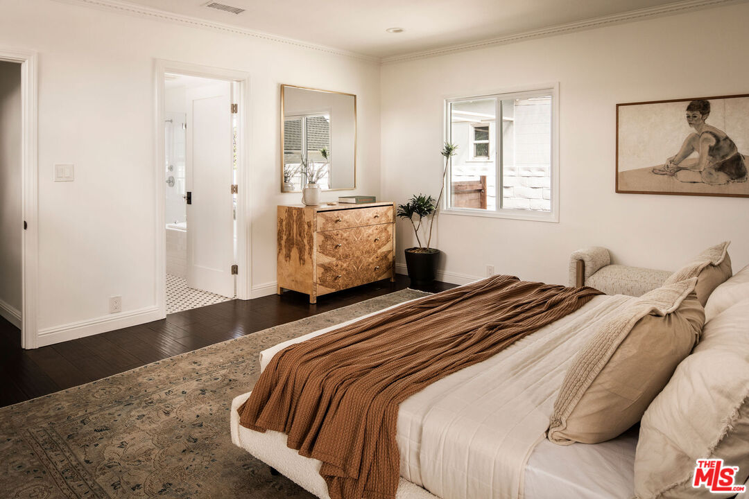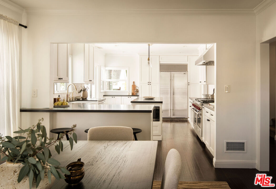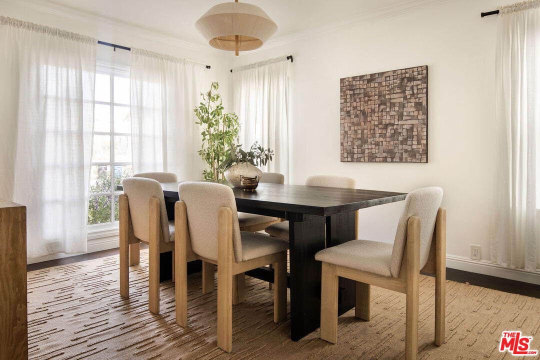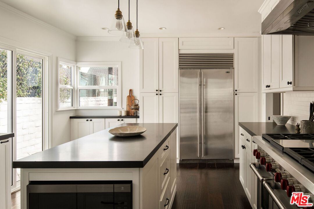 In the heart of Larchmont Village, the property consists of a 3 bed, 3 bath, 2,125 sq. ft. home plus 335 sq. ft. poolside studio with kitchenette and bathroom, offering privacy, elevated design, and effortless indoor/outdoor living. Thoughtful details abound from the chef's kitchen with premium appliances, to a serene primary suite opening to the backyard, to an additional 615 sq. ft. loft space upstairs. Designed for entertaining and everyday ease, and situated just two blocks from Larchmont's best restaurants and bars, the magical home offers a sanctuary in one of LA's most sought-after neighborhoods. A picturesque walkway canopied by an oversized front oak tree leads to the front entry, where a long foyer introduces the home's inviting layout. The living room, anchored by a gorgeous fireplace, offers a warm gathering space, while the dining room flows effortlessly into the kitchen for seamless hosting. The kitchen is both functional and stylish, centered by a honed granite island, bar seating, and ample cabinetry for home storage. Premium appliances include a Wolf range and oven, a side-by-side Sub-Zero refrigerator and freezer, a Bosch dishwasher, an LG microwave, and a wine refrigerator. The kitchen opens to a beautiful private dining patio with an outdoor heater, perfect for entertaining and dining al fresco year-round. Down the hallway, find two spacious bedrooms sharing a full bath finished with a Restoration Hardware vanity. The primary suite sits at the rear of the home, a private retreat with a spa-like bath featuring a dual-sink vanity, soaking tub, and standing shower. A back room offers a flexible space that can be used as an office or converted to a large walk-in closet with French doors opening to the side yard. Backyard living feels like a private oasis - fully fenced with a grassy lawn, patio with an electric awning, and sparkling pool and spa. A detached studio enhances the setting with its own living area, full bathroom, kitchenette featuring Bertazzoni and Fisher & Paykel appliances, plus a full-sized refrigerator and freezer. Sliding doors open directly to the pool deck, making it ideal for guests or entertaining. Upgrades throughout the residence include newer engineered hardwood flooring, a dedicated 240V outlet for EV charging at the front of the home, Nest security cameras, and a newer Carrier HVAC system with condenser and all-new ductwork. Additional highlights feature a newer tankless water heater, upgraded electrical and plumbing systems, and newer windows, doors, and sliders throughout. Just moments from Larchmont Village, the home offers easy access to endless shops and eateries, including Great White, Cookbook, Larchmont Bungalow, Larchmont Wine & Cheese, Sam's Bagels, Go Get 'Em Tiger, Jeni's Ice Cream, and more. This private and serene residence blends small-town charm with city convenience, an elevated lifestyle in one of Los Angeles' most desirable neighborhoods.