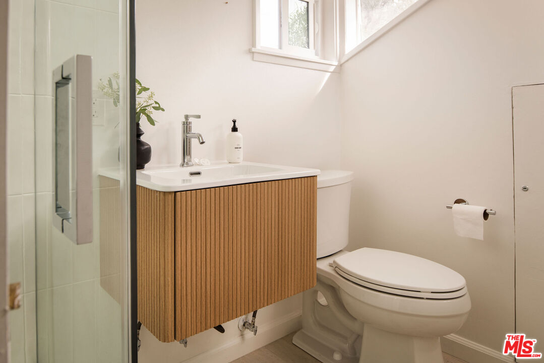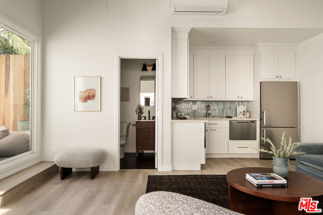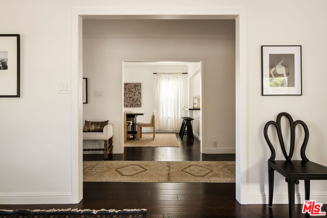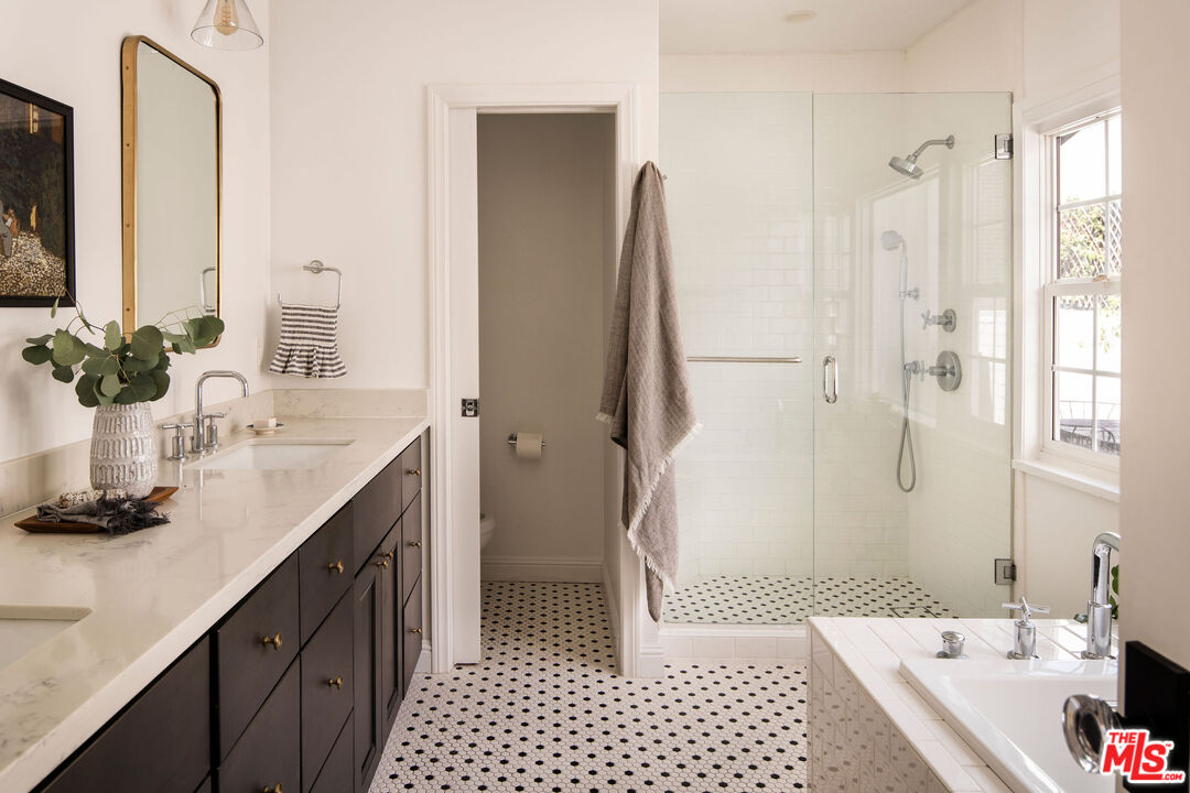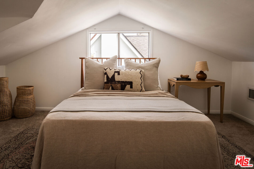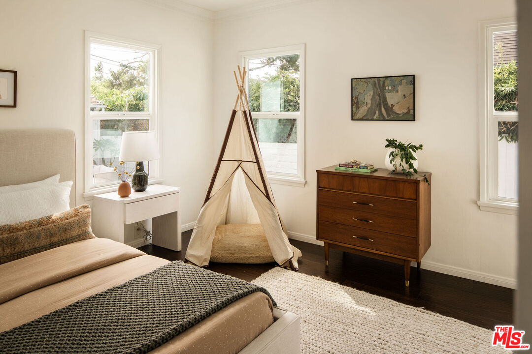In the heart of Larchmont Village, the property consists of a 3 bed, 3 bath, 2,125 sq. ft. home plus 335 sq. ft. poolside studio with kitchenette and bathroom, offering privacy, elevated design, and effortless indoor/outdoor living. Thoughtful details abound from the chef's kitchen with premium appliances, to a serene primary suite opening to the backyard, to an additional 615 sq. ft. loft space upstairs. Designed for entertaining and everyday ease, and situated just two blocks from Larchmont's best restaurants and bars, the magical home offers a sanctuary in one of LA's most sought-after neighborhoods. A picturesque walkway canopied by an oversized front oak tree leads to the front entry, where a long foyer introduces the home's inviting layout. The living room, anchored by a gorgeous fireplace, offers a warm gathering space, while the dining room flows effortlessly into the kitchen for seamless hosting. The kitchen is both functional and stylish, centered by a honed granite island, bar seating, and ample cabinetry for home storage. Premium appliances include a Wolf range and oven, a side-by-side Sub-Zero refrigerator and freezer, a Bosch dishwasher, an LG microwave, and a wine refrigerator. The kitchen opens to a beautiful private dining patio with an outdoor heater, perfect for entertaining and dining al fresco year-round. Down the hallway, find two spacious bedrooms sharing a full bath finished with a Restoration Hardware vanity. The primary suite sits at the rear of the home, a private retreat with a spa-like bath featuring a dual-sink vanity, soaking tub, and standing shower. A back room offers a flexible space that can be used as an office or converted to a large walk-in closet with French doors opening to the side yard. Backyard living feels like a private oasis - fully fenced with a grassy lawn, patio with an electric awning, and sparkling pool and spa. A detached studio enhances the setting with its own living area, full bathroom, kitchenette featuring Bertazzoni and Fisher & Paykel appliances, plus a full-sized refrigerator and freezer. Sliding doors open directly to the pool deck, making it ideal for guests or entertaining. Upgrades throughout the residence include newer engineered hardwood flooring, a dedicated 240V outlet for EV charging at the front of the home, Nest security cameras, and a newer Carrier HVAC system with condenser and all-new ductwork. Additional highlights feature a newer tankless water heater, upgraded electrical and plumbing systems, and newer windows, doors, and sliders throughout. Just moments from Larchmont Village, the home offers easy access to endless shops and eateries, including Great White, Cookbook, Larchmont Bungalow, Larchmont Wine & Cheese, Sam's Bagels, Go Get 'Em Tiger, Jeni's Ice Cream, and more. This private and serene residence blends small-town charm with city convenience, an elevated lifestyle in one of Los Angeles' most desirable neighborhoods.