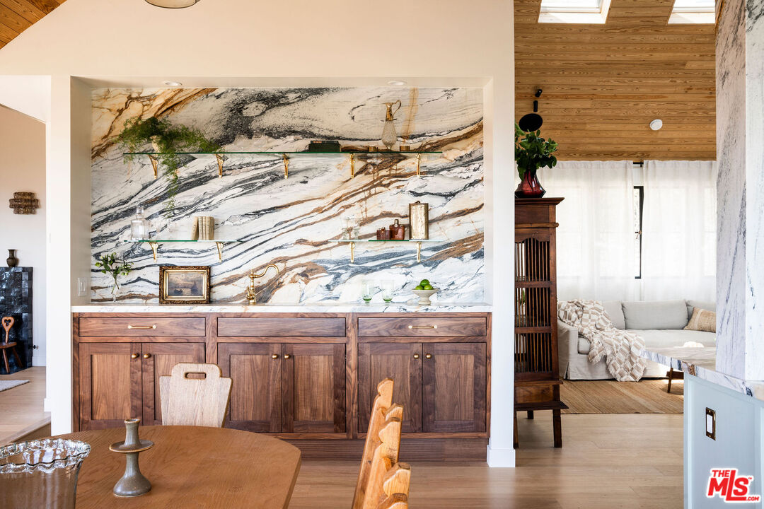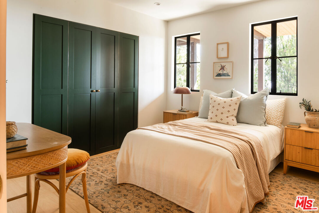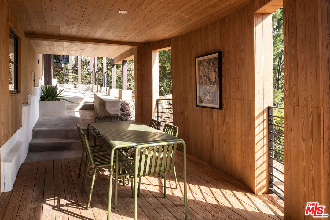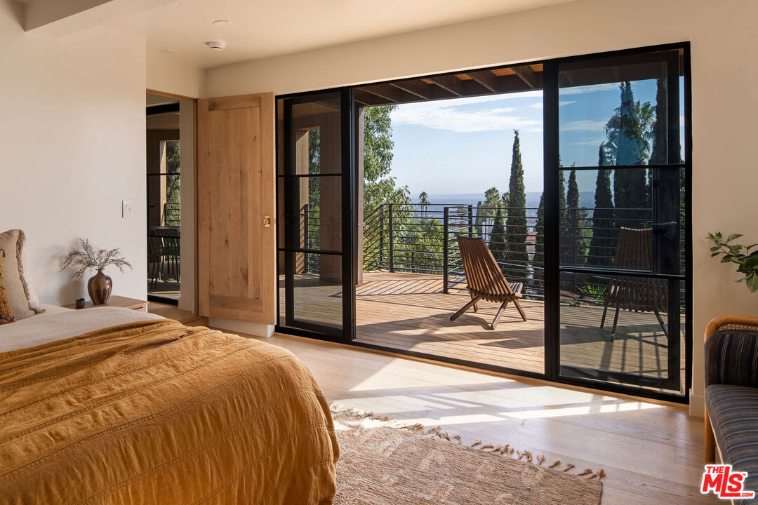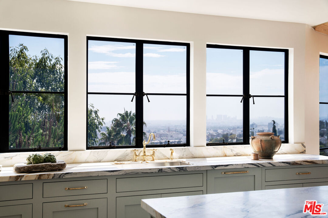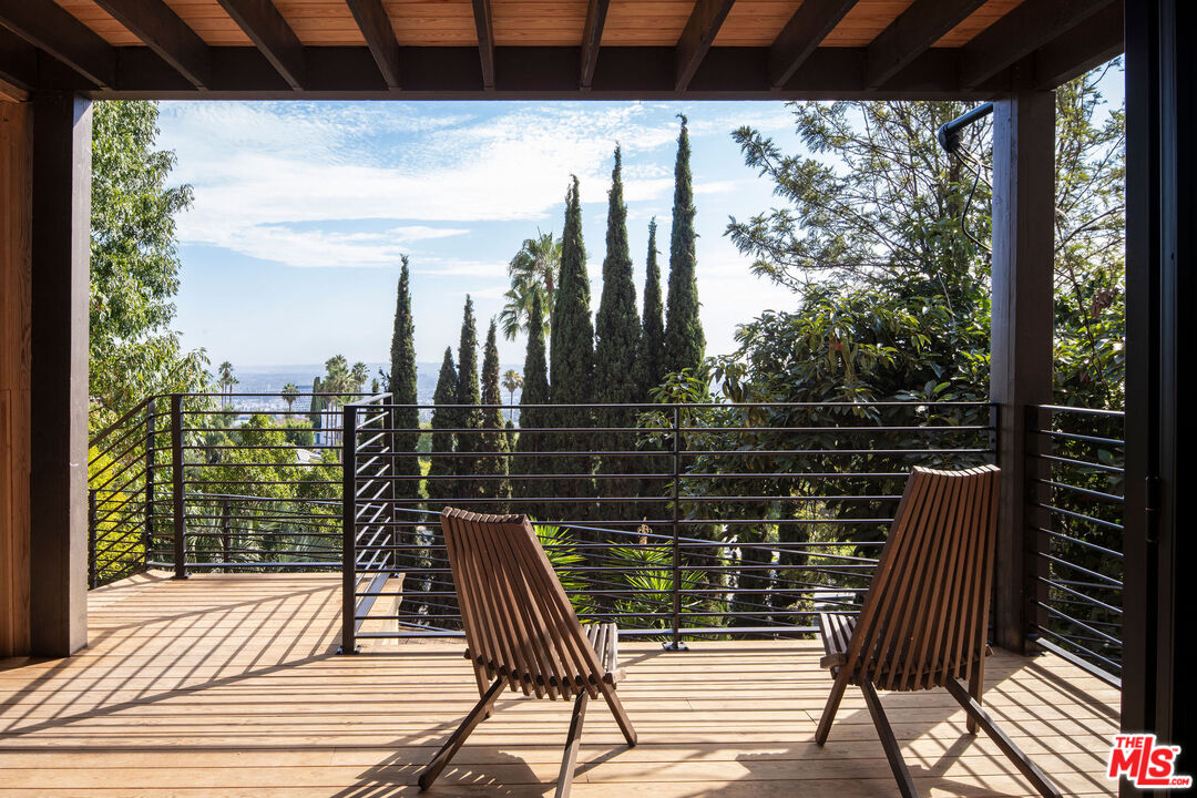 Brand newly renovated in 2025, this stunning 5 bed, 5 bath home in coveted Los Feliz Oaks offers over 3,500 square feet of expertly designed living space with spectacular city views in nearly every room - a true hilltop refuge. The beautifully updated home features high-end, custom finishes throughout, offering luxurious design and ease of living. The ideal floorplan includes a connected 4-car garage and a lower level with three bedrooms, featuring a primary suite with dual closets and a breathtaking primary bathroom, along with a guest suite complete with kitchenette. The home features patios on every floor and expansive lower decking surrounded by mature trees. Past the striking pine-sided facade, the front door opens to the main living space with soaring vaulted ceilings, wide-plank white oak floors, and abundant windows allowing majestic city views and natural light. A striking black zellige tiled fireplace anchors the airy living room, with windowed doors leading to the top balcony showcasing expansive views of downtown LA, Griffith Park, and the ocean. The adjacent dining space features wood-vaulted ceilings centered by a hand-blown glass chandelier. The expansive chef's kitchen offers inset shaker cabinetry with unlacquered brass hardware, Carrara Picasso marble countertops, a walnut-marble wet bar, and premium appliances, including a Bertazzoni 48" range, Thermador refrigerator/freezer, Bosch dishwasher, and pot filler under an angular gold vent hood. The lower level offers a laundry room and three bedrooms: the primary suite, second bedroom, and Junior ADU. The show-stopping primary suite features its own zellige tiled fireplace, French doors to a private balcony, and dual walk-in closets. The ensuite bathroom offers brass-inlaid tile flooring and a Calacatta Viola dual-sink vanity, surrounded by a marble shower with dual rain showerheads, water closet, and freestanding soaking tub next to floor-to-ceiling windows. The Junior ADU provides a fully independent living space with quartzite counters, Thermador and Bosch appliances, custom closets, and a luxe bath with Calacatta Gold marble - ideal for guests or rental income. The fifth bedroom occupies the bottom level with French doors to a sprawling deck and wood-paneled bath. Every system has been upgraded, including copper plumbing, new electrical panels, multi-zone HVAC with Ecobee smart controls, tankless water heaters, and 10-speaker surround sound. The finished garage accommodates four cars with 240V EV charging. Exterior thermally modified pine siding is fire-resistant. Outdoor living features ORCA-tiled walkways, multiple expansive decks with custom steel railings, fresh landscaping with irrigation and lighting, and new concrete staircases connecting every corner of the property. Ideally located minutes from Griffith Observatory, Hollywood Sign, Greek Theatre, and Hollywood Bowl, plus neighborhood favorites like Beachwood Cafe, The Oaks Gourmet Market & Cafe, and La Villita Cantina. A rare offering in Los Feliz Oaks combining architectural history with modern luxury.