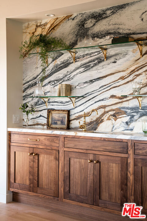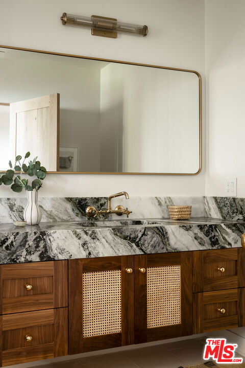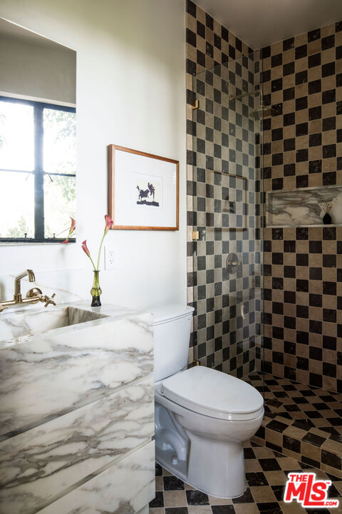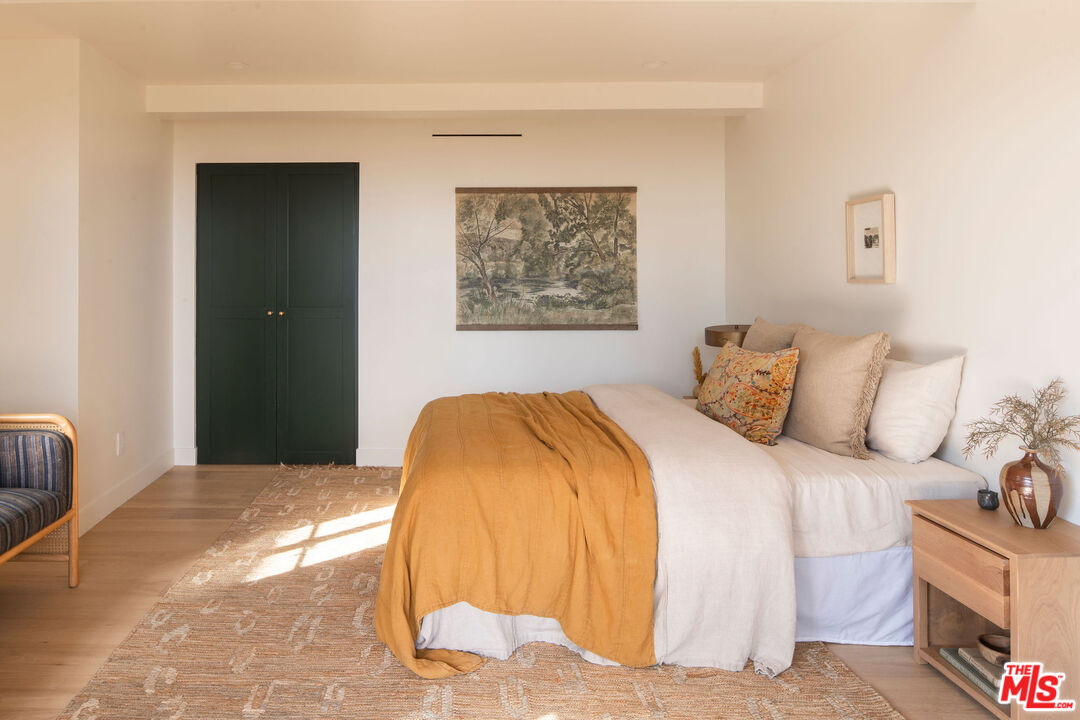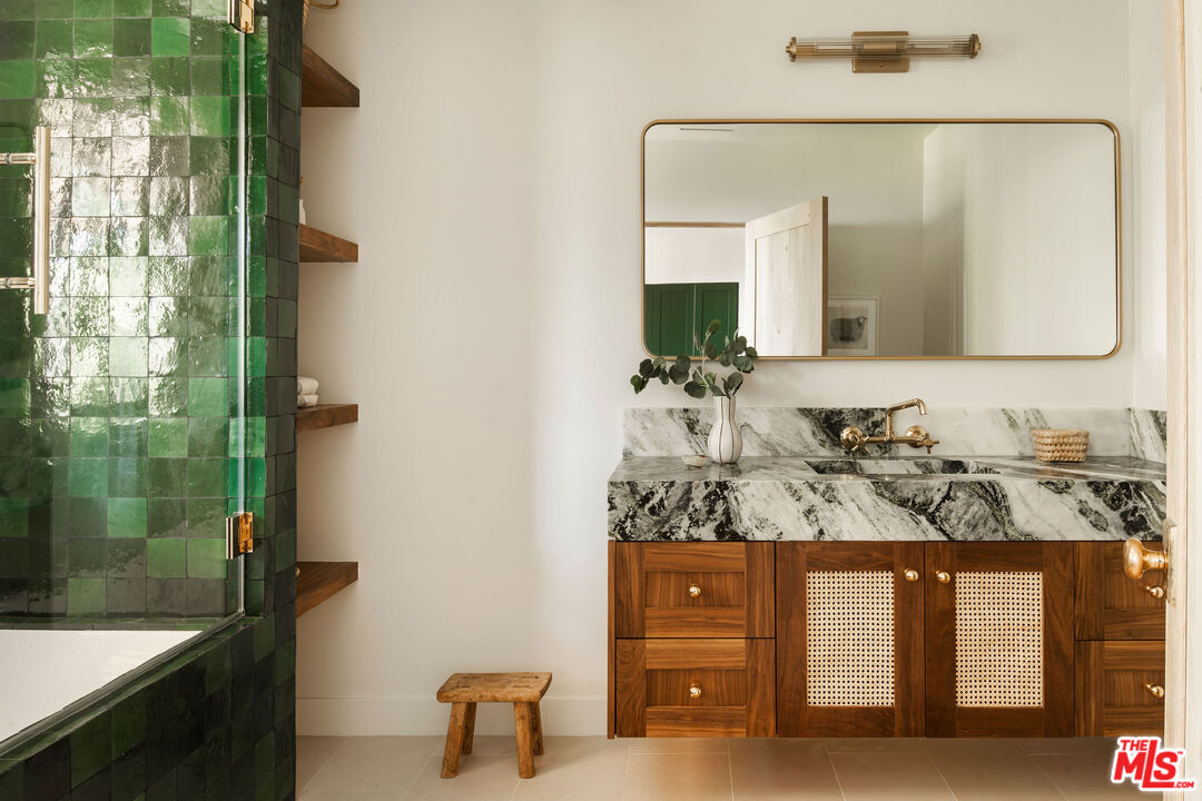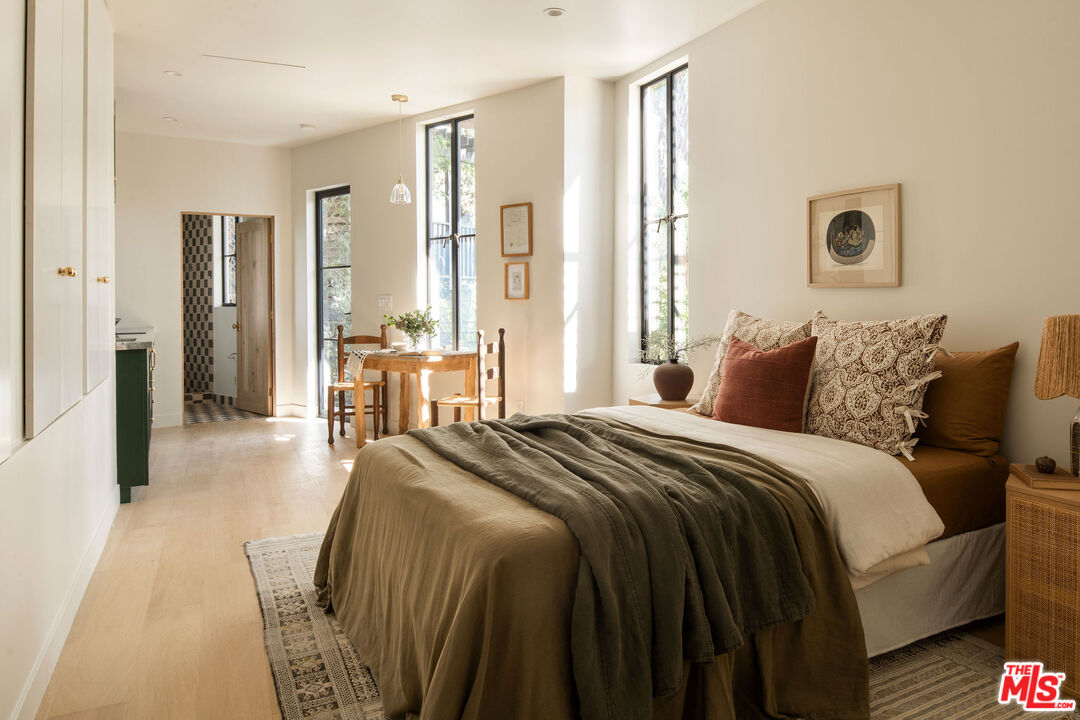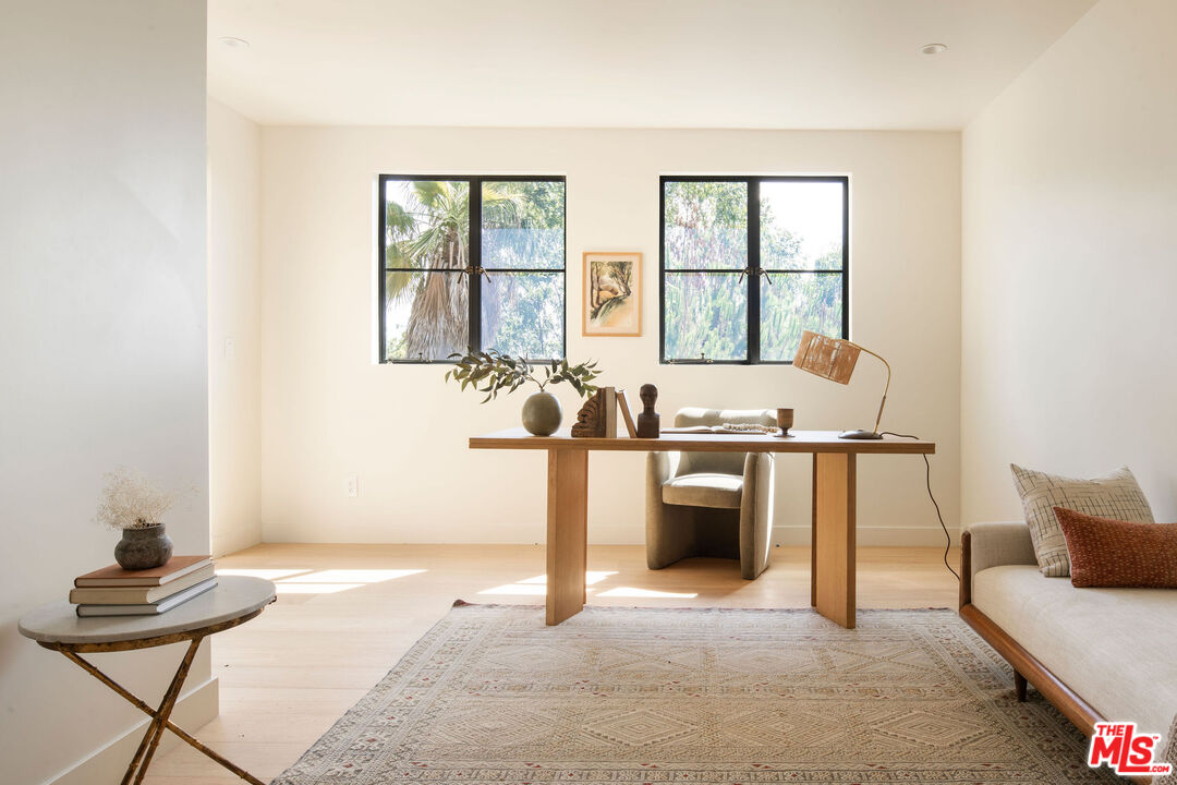 Brand newly renovated in 2025, this stunning 5 bed, 5 bath home in coveted Los Feliz Oaks offers over 3,500 square feet of expertly designed living space with spectacular city views in nearly every room - a true hilltop refuge. The beautifully updated home features high-end, custom finishes throughout, offering luxurious design and ease of living. The ideal floorplan includes a connected 4-car garage and a lower level with three bedrooms, featuring a primary suite with dual closets and a breathtaking primary bathroom, along with a guest suite complete with kitchenette. The home features patios on every floor and expansive lower decking surrounded by mature trees. Past the striking pine-sided facade, the front door opens to the main living space with soaring vaulted ceilings, wide-plank white oak floors, and abundant windows allowing majestic city views and natural light. A striking black zellige tiled fireplace anchors the airy living room, with windowed doors leading to the top balcony showcasing expansive views of downtown LA, Griffith Park, and the ocean. The adjacent dining space features wood-vaulted ceilings centered by a hand-blown glass chandelier. The expansive chef's kitchen offers inset shaker cabinetry with unlacquered brass hardware, Carrara Picasso marble countertops, a walnut-marble wet bar, and premium appliances, including a Bertazzoni 48" range, Thermador refrigerator/freezer, Bosch dishwasher, and pot filler under an angular gold vent hood. The lower level offers a laundry room and three bedrooms: the primary suite, second bedroom, and Junior ADU. The show-stopping primary suite features its own zellige tiled fireplace, French doors to a private balcony, and dual walk-in closets. The ensuite bathroom offers brass-inlaid tile flooring and a Calacatta Viola dual-sink vanity, surrounded by a marble shower with dual rain showerheads, water closet, and freestanding soaking tub next to floor-to-ceiling windows. The Junior ADU provides a fully independent living space with quartzite counters, Thermador and Bosch appliances, custom closets, and a luxe bath with Calacatta Gold marble - ideal for guests or rental income. The fifth bedroom occupies the bottom level with French doors to a sprawling deck and wood-paneled bath. Every system has been upgraded, including copper plumbing, new electrical panels, multi-zone HVAC with Ecobee smart controls, tankless water heaters, and 10-speaker surround sound. The finished garage accommodates four cars with 240V EV charging. Exterior thermally modified pine siding is fire-resistant. Outdoor living features ORCA-tiled walkways, multiple expansive decks with custom steel railings, fresh landscaping with irrigation and lighting, and new concrete staircases connecting every corner of the property. Ideally located minutes from Griffith Observatory, Hollywood Sign, Greek Theatre, and Hollywood Bowl, plus neighborhood favorites like Beachwood Cafe, The Oaks Gourmet Market & Cafe, and La Villita Cantina. A rare offering in Los Feliz Oaks combining architectural history with modern luxury.